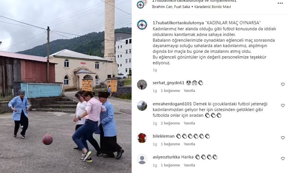 İlçeye bağlı Büyükmahalle’de yer alan 17 Şubat Ortaokulu bahçesinde erkek öğrenciler ve veliler arasında oynanan maç sırasında ortaya çıkan renkli görüntüler, okulun kadın personelini de harekete geçirdi. Mola saatinde bir araya gelen kadın çalışanlar, okulun bahçesinde top koşturdu. Eğlenceli anların yaşandığı maçta, kimi gol attı kimi kaleye geçti kimi de tribün havasında arkadaşlarını destekledi. Sosyal medyada paylaşılan görüntüler beğeni toplarken, kadınların futbol oynadığı anlara takipçiler, ‘Her işin üstesinden gelirler, futbol da onlar için sıradan’, ‘Demek ki, çocuklardaki futbol yeteneği kadınlardan geliyor’ şeklinde yorumlarda bulundu.