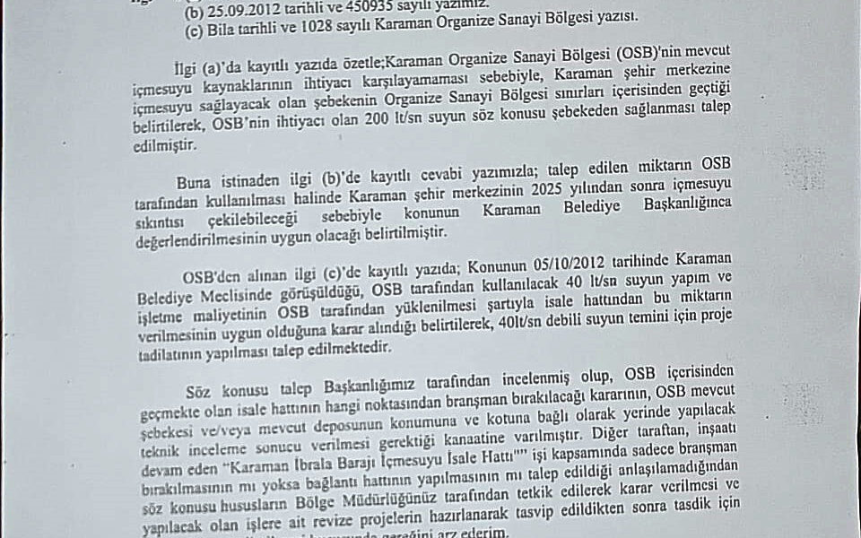 Hüseyin Mutlu, “Konuyu araştırırken Karaman Organize Sanayi Bölgesinin 2012 yılında yapılacak olan bu hattan, saniyede 200 litre su talep ettiği ve DSİ yetkililerinin, belediyeye yazdığı resmi yazıda sanki bugünü görmüşçesine OSBnin bu suyu kullanması durumunda 2025 yılında Karamanın su sıkıntısı çekeceğini açıkça resmi yazı ile bildirmiş. Bugün gelinen noktada kayıp kaçak oranlarından yola çıkılarak OSBnin herhangi bir aboneliği yok, herhangi bir tahakkuku yok, herhangi bir ödemesi yok. 2019 yılından itibaren bu suyu bedava kullandığı ancak bunu üyelerine güncel rakamla 32 liradan sattığı ortaya çıkmıştır. Biz bu konuyla alakalı Cumhuriyet Başsavcılığına suç duyurusunda bulunduk. Şu an su sıkıntısıyla alakalı birçok hemşehrimiz mağdur olmuştur. Bununla alakalı ihmali olanların ve kusuru olanların da cezalandırılmasını talep ediyoruz” diye konuştu.