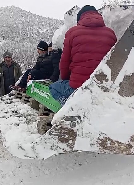 Kardan kapanan yolda cenaze iş makinesinin kepçesinde taşındı; o anlar kamerada