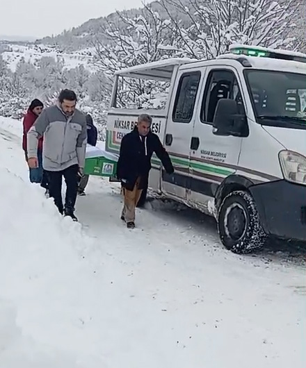 Niksar ilçe merkezinde vefat eden Cafer Öztürkün cenazesi, bugün defnedilmek üzere Niksar Belediyesine ait cenaze aracıyla Akgüney köyüne götürülmek istendi. Cenaze aracı, köy yolunun kar nedeniyle kapalı olması sonucu yolda kaldı. Bunun üzerine vatandaşlar İl Özel İdaresinden yardım istedi. İl Özel İdaresince gönderilen iş makinesinin kepçesine naaş konulurken, tabutu tutmak için de kepçeye 2 kişi bindi. Cenaze, iş makinesinin kepçesinde Akgüney köyüne götürüldü. Öztürkün cenazesi, kılınan cenaze namazının ardından toprağa verildi. Cenazenin iş makinesinin kepçesinde taşınması, cep telefonu kamerasıyla görüntülendi.