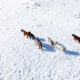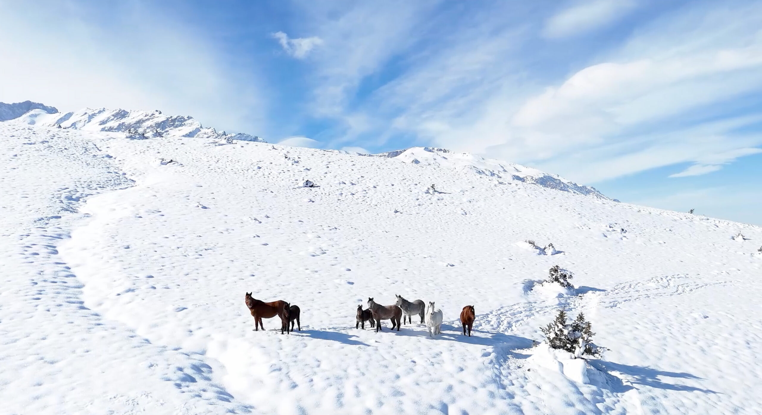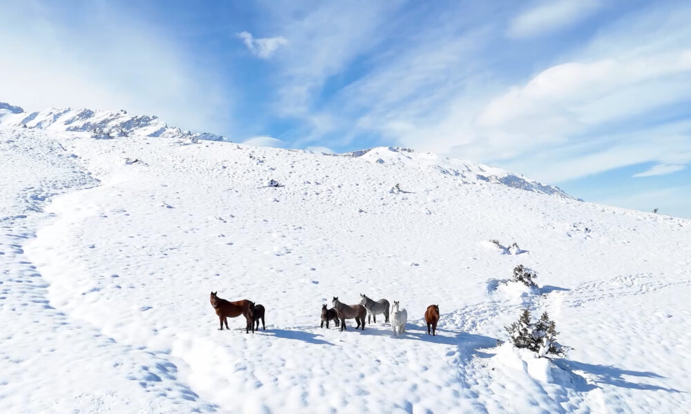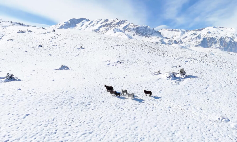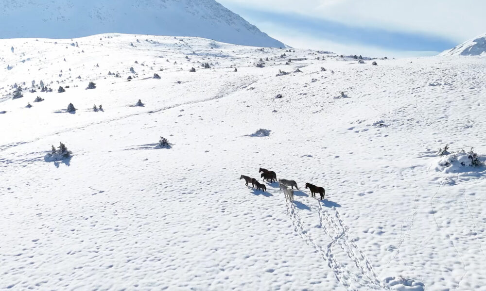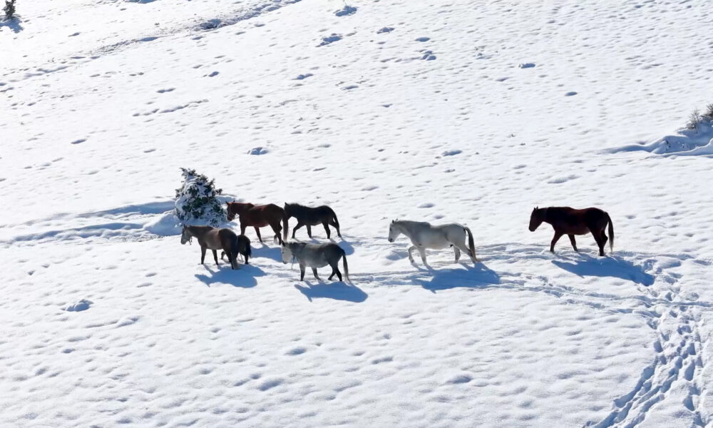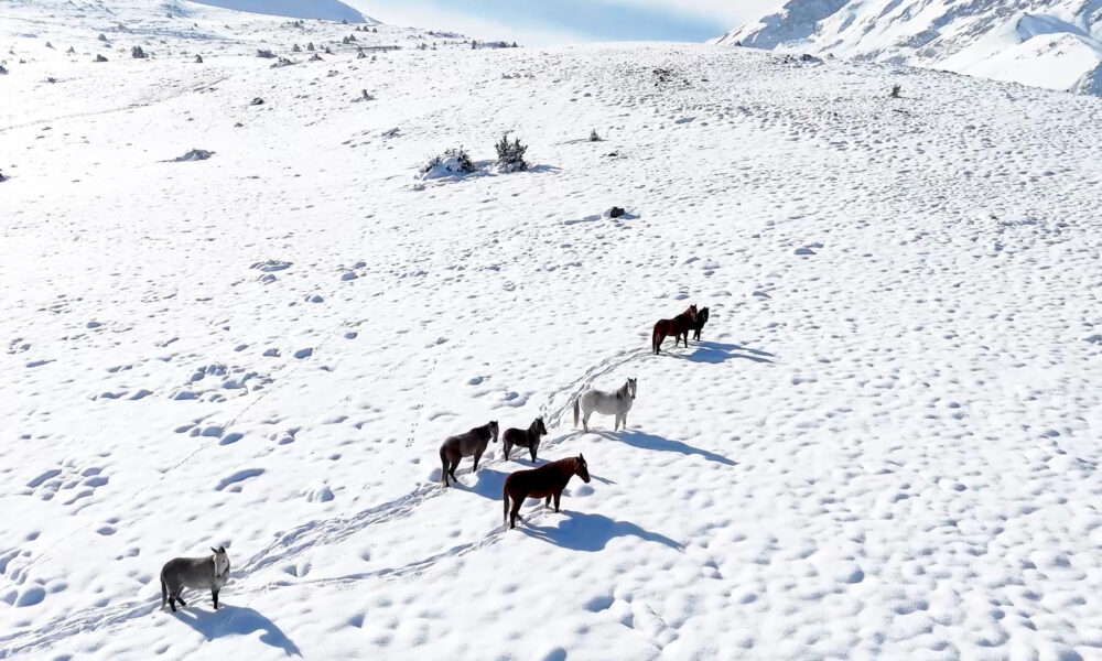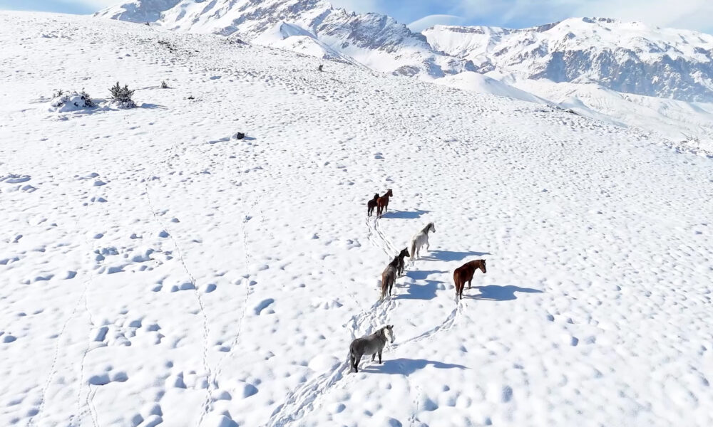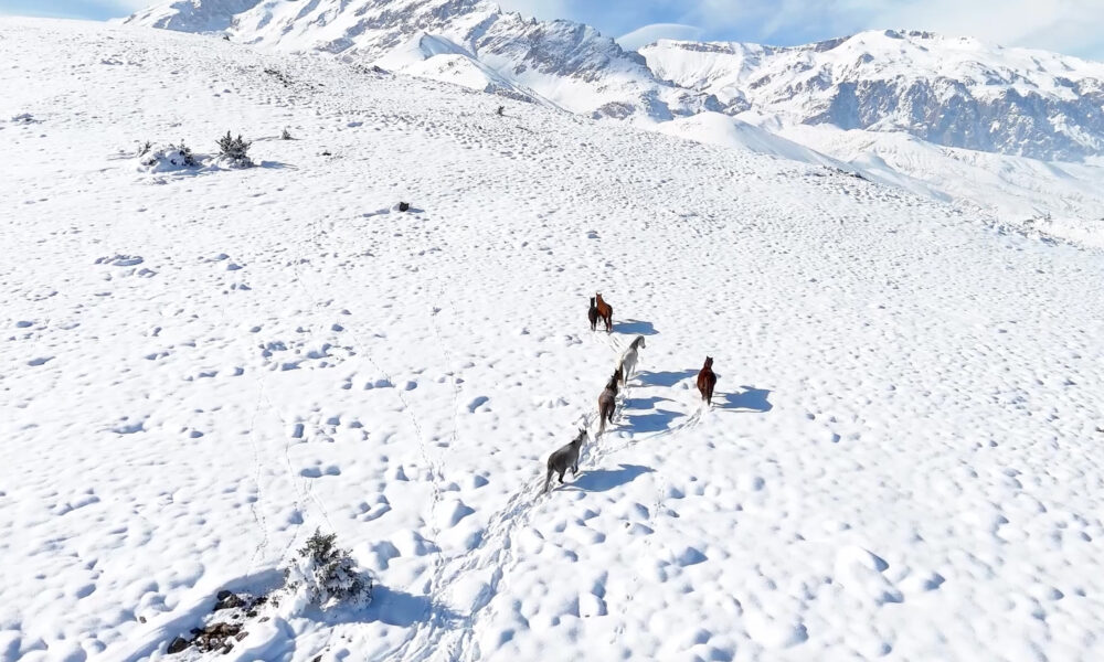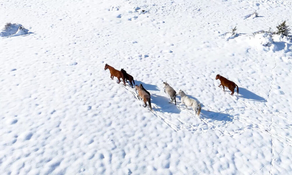 Karla kaplı bölgede gezen yılkı atları dron kamerasında