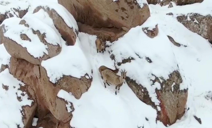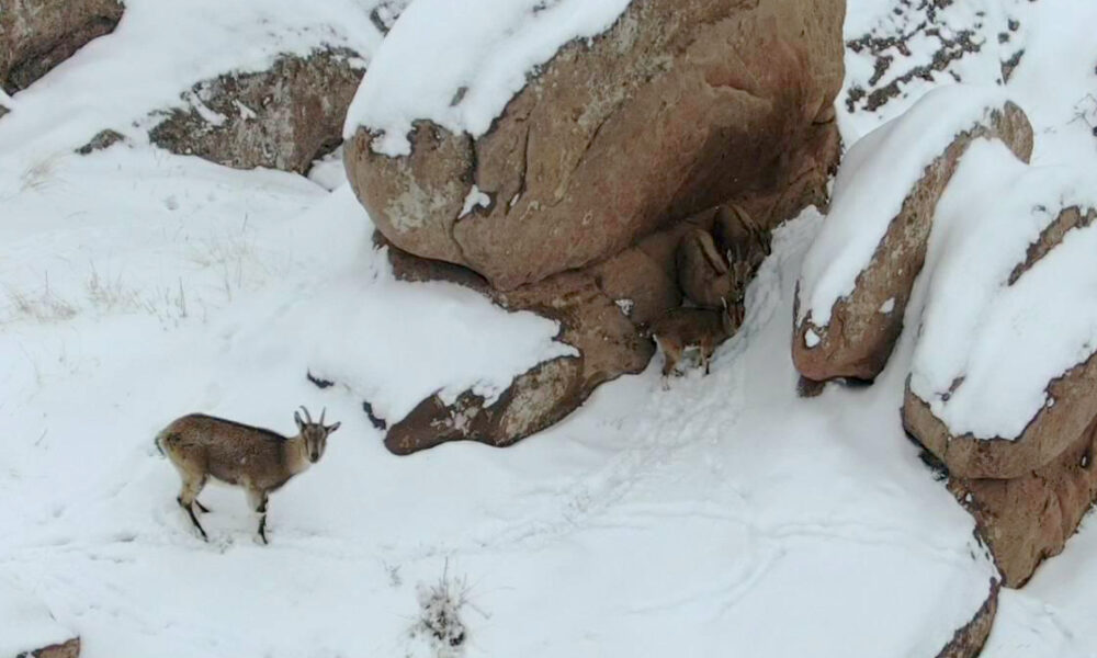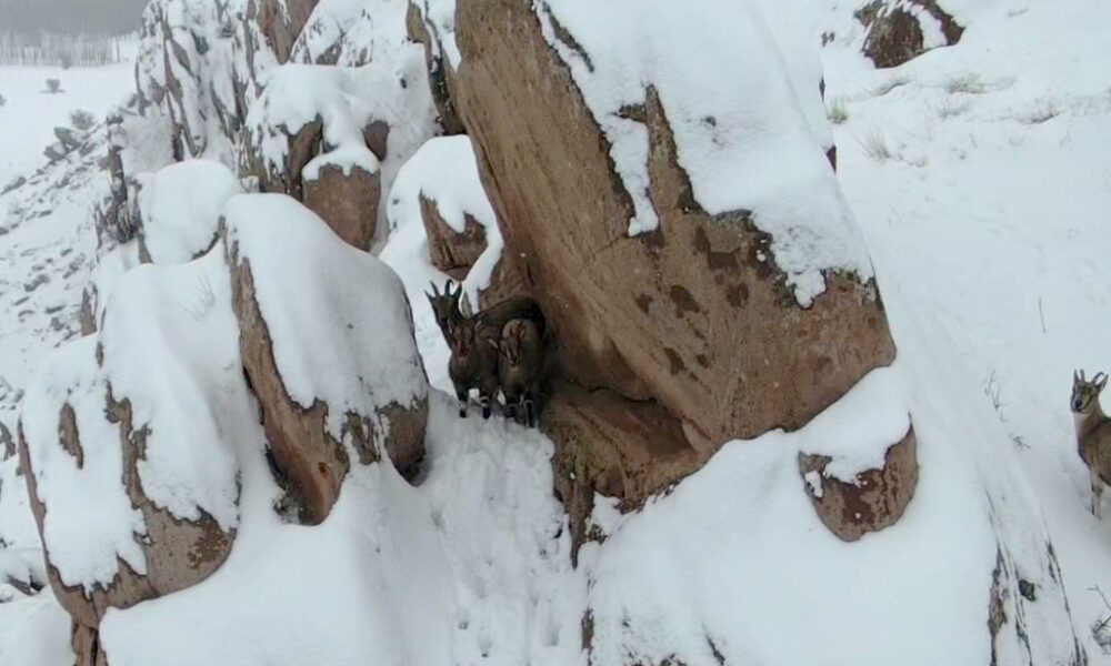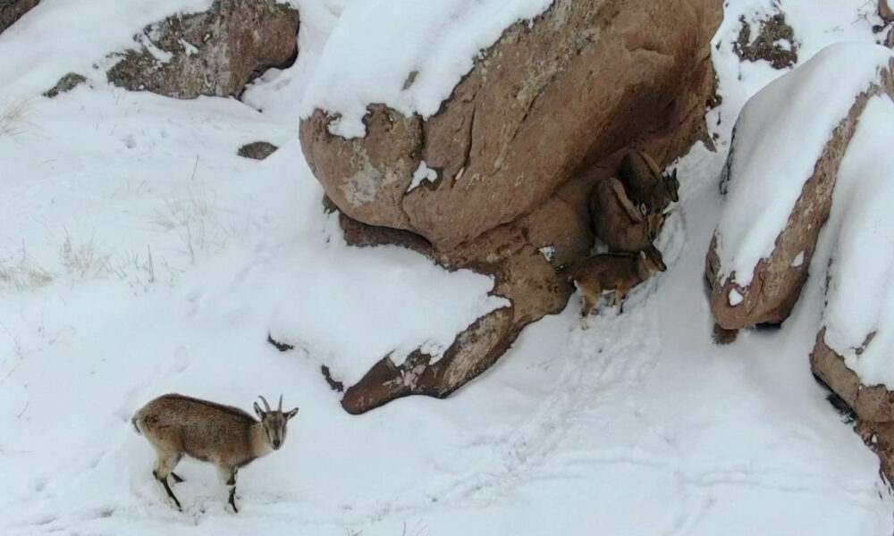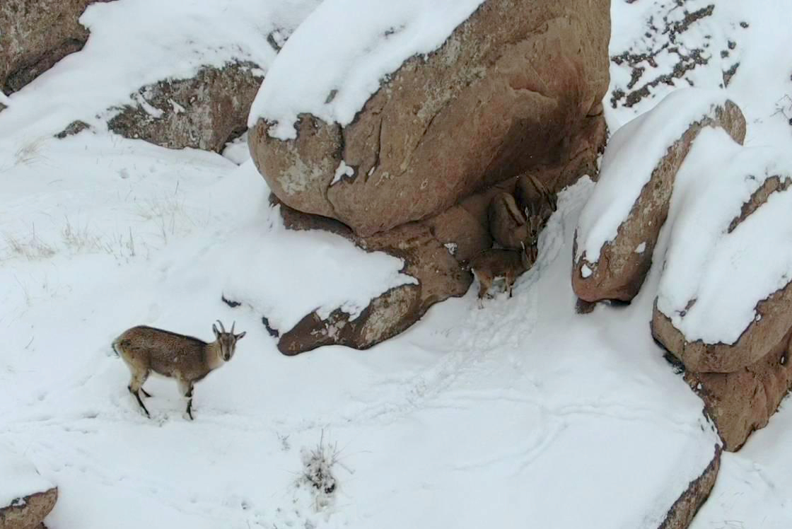 Özellikle sarp arazilerdeki tırmanma ve zor şartlarda yaşamlarını devam ettirme özellikleri ile bilinen dağ keçileri, yavruları ile kent merkezi yakınlarında görüntülendi. Kar birikintisi altındaki kayalıklar arasında dolaşan ve yiyecek arayan keçiler, amatör dron kamerasına takıldı. Bir süre gezinen keçi sürüsü, daha sonra kayalar arasından geçerek gözden kayboldu.