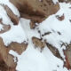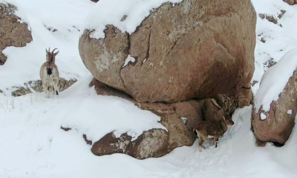 Karla kaplı kayalıklarda dolaşan dağ keçileri kamerada