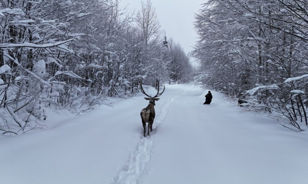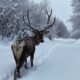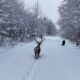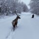 Karla kaplı yaylada yürüyen geyik dron kamerasında