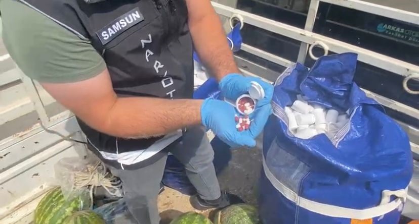 Samsun İl Emniyet Müdürlüğü Narkotik Suçlarla Mücadele Şube Müdürlüğü ekipleri, farklı bir ilden Samsuna yüklü miktarda uyuşturucu madde getirileceği bilgisine ulaştı. Teknik ve fiziki takibin ardından 3 gün süren operasyon planlandı. Şüphelilerin bulunduğu karpuz yüklü kamyonet, Ladik ilçesi Hacıali Mahallesinde durduruldu. Araçta yapılan aramada; 110 bin 466 sentetik hap ile uyuşturucu ticaretinden elde edildiği değerlendirilen 598 bin 770 lira ele geçirildi. Araçta bulunan A.Ö. (39), S.A.S. (24), M.Y. (51), K.H. (39), Ş.Y. (29) ve H.D. (27) gözaltına alındı.
