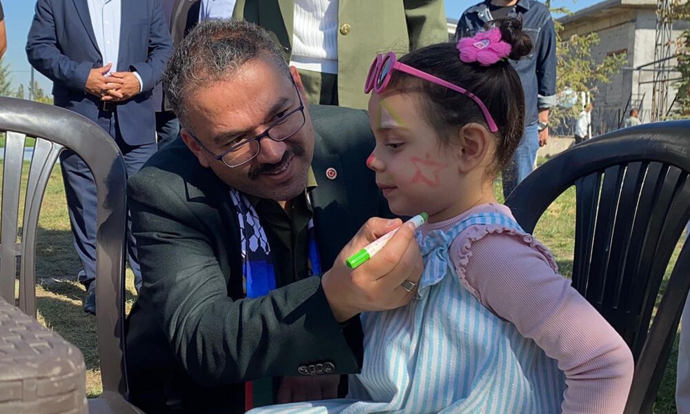 Millet bahçesindeki etkinlikte çocukların yüzlerini boyayan Iğdır Valisi Ercan Turan (Solda), çocukların anlamlı bir etkinlik yaptığını söyledi. Fotoğraf: Suat DENİZ / Iğdır,(DHA)