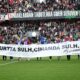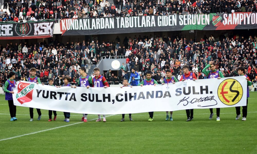 Karşıyaka ve Eskişehirspor taraftarlarının dünkü maçta sergiledikleri karşılıklı dostluk tablosu alkış aldı. Taraftarlar, Alsancak Stadında karşılaşmadan önce Atatürkün, “Yurtta sulh, cihanda sulh” sözlerinin yazılı olduğu ve iki kulübün logosunu taşıyan pankartla sahada barışı sembolize eden beyaz güvercinler uçurdu. Karşıyaka taraftarları bu esnada, “Savaşlar olmasın, çocuklar ölmesin” diye tezahürat yaparak savaşlara tepki gösterip barış mesajları verdi. Maçın ilk yarısında Eskişehirspor taraftarlarının bir kısmının dışarına kalmasına iki takım tribünleri birlikte tepki gösterdi. Karşıyakalılar, ilk yarıda şiddetli yağış nedeniyle konuk taraftarların kendi tribünlerine alınmasını da istedi. Eskişehirliler dışarıda kalan arkadaşları nedeniyle tepki gösterip ilk yarı bitmeden misafir tribünü boşalttı. İki takımın teknik direktörleri Burhanettin Basatemür ve Hakan Şapçı da maç öncesi uzun süre sohbet etti.