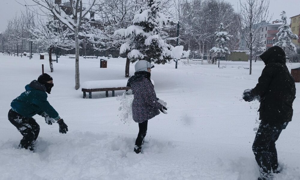 Valilik kararıyla okulların tatil edildiği kentte, çocuklar tatili fırsat bilerek sokaklarda kar topu oynayıp, kardan adam yaptı.