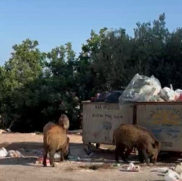 Kaş’ta yaban domuzları kent merkezine inip, yiyecek aradı; o anlar kamerada