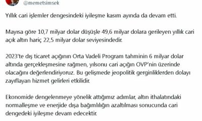 HAZİNE ve Maliye Bakanı Mehmet Şimşek, “Yıllık cari işlemler dengesindeki iyileşme kasım ayında da devam etti. Mayısa göre 10,7 milyar dolar düşüşle 49,6 milyar dolara gerileyen...