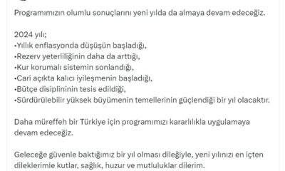 HAZİNE ve Maliye Bakanı Mehmet Şimşek, “2024 yılı; yıllık enflasyonda düşüşün başladığı, rezerv yeterliliğinin daha da arttığı, kur korumalı sistemin sonlandığı, cari açıkta kalıcı iyileşmenin başladığı,...