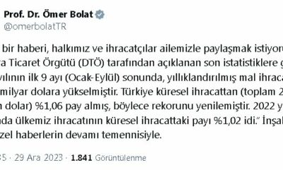 TİCARET Bakanı Ömer Bolat, “2023 yılının ilk 9 ayı sonunda, yıllıklandırılmış mal ihracatımız 253,3 milyar dolara yükselmiştir. Türkiye küresel ihracattan yüzde 1,06 pay almış, böylece rekorunu...
