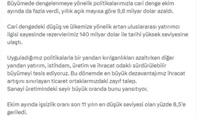 TİCARET Bakanı Ömer Bolat, “Dış ticaret açığındaki azalışın, kasım ayında cari işlemler hesabına pozitif katkı sağlamayı sürdüreceğini bekliyoruz. Önümüzdeki süreçte yıllıklandırılmış bazda cari işlemler açığında düşüşün...