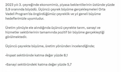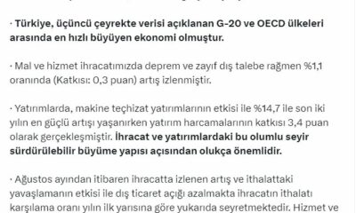 CUMHURBAŞKANI Yardımcısı Cevdet Yılmaz, “Açıklanan küresel büyüme verilerine göre; 3’üncü çeyrekte OECD ve G-20 ülkeleri arasında en iyi büyüme performansı gösteren birinci ülke konumundayız” dedi. Cumhurbaşkanı...