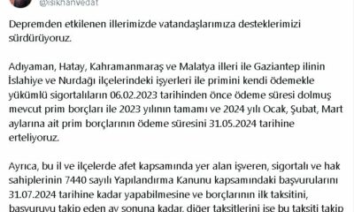 ÇALIŞMA ve Sosyal Güvenlik Bakanı Vedat Işıkhan, Adıyaman, Hatay, Kahramanmaraş ve Malatya ile Gaziantep’in İslahiye ve Nurdağı ilçelerinde sigorta primini kendisi ödemekle yükümlü vatandaşların, prim borcu ödeme süresinin...