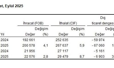 TÜİK, Eylül 2025 dönemine ilişkin dış ticaret istatistiklerini açıkladı. Buna göre; ihracat 2025 yılı eylül ayında, bir önceki yılın aynı ayına göre yüzde 2,8 artarak 22...