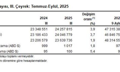 TÜİK, 2025 yılı 3üncü çeyreğine ilişkin turizm istatistiklerini açıkladı. Buna göre; turizm geliri temmuz, ağustos ve eylül aylarından oluşan 3üncü çeyrekte bir önceki yılın aynı çeyreğine...