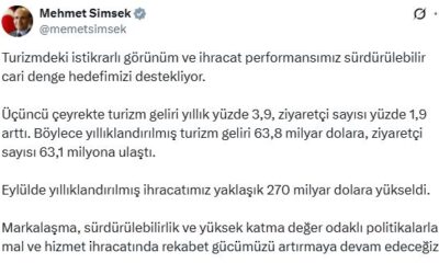 Hazine ve Maliye Bakanı Mehmet Şimşek, turizm ve dış ticaret istatistiklerine ilişkin sosyal medya hesabından açıklama yaptı. Bakan Şimşek, “Turizmdeki istikrarlı görünüm ve ihracat performansımız sürdürülebilir...