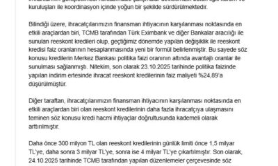 Türkiye Cumhuriyet Merkez Bankası (TCMB), reeskont kredilerinin günlük limitinin 1 Kasım itibariyle geçerli olmak üzere 4,5 milyar TLye çıkarılmasına karar verdi. Ticaret Bakanı Ömer Bolat, TCMBnin...