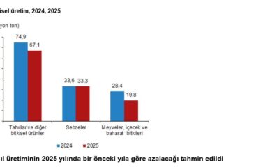 TÜİK, 2025 yılı bitkisel üretim 2nci tahminini yayımladı. Buna göre; üretim miktarlarının, 2025 yılı ikinci tahmininde bir önceki yıla göre tarla ürünleri olan tahıllar ve diğer...