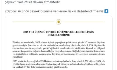 Bakan Bolat, sosyal medya hesabından 2025 yılı 3üncü çeyrek büyüme verilerine ilişkin açıklama yaptı. Bolat, “Türkiye, 2025 yılı 3’üncü çeyrekte yüzde 3,7 oranında güçlü bir büyüme...