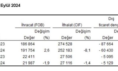 TÜİK, Eylül 2024 dönemine ilişkin dış ticaret istatistiklerini açıkladı. Buna göre; eylül ayında ihracat bir önceki yılın aynı ayına göre yüzde 1,9 azalarak 21 milyar 987...