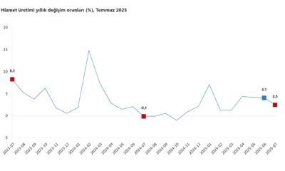 TÜİK, Temmuz 2025 dönemine ilişkin hizmet üretim endeksi verilerini açıkladı. Buna göre; hizmet üretimi temmuz ayında bir önceki yılın aynı ayına göre yüzde 2,5 arttı. Aynı...