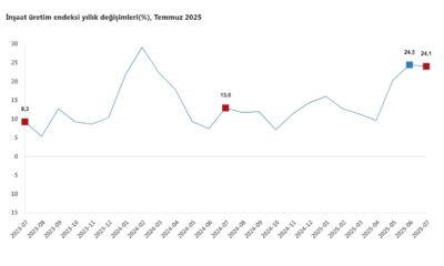 TÜİK, Temmuz 2025 dönemine ilişkin inşaat üretim endeksi verilerini açıkladı. Buna göre; inşaat üretimi bir önceki yılın aynı ayına göre yüzde 24,1 arttı. İnşaatın alt sektörleri...