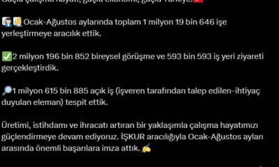Bakan Işıkhan, sosyal medya hesabından yaptığı açıklamada, “Güçlü çalışma hayatı, güçlü ekonomi, güçlü Türkiye. Ocak-Ağustos aylarında toplam 1 milyon 19 bin 646 işe yerleştirmeye aracılık ettik....