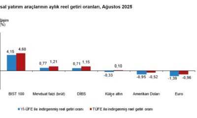 TÜİK, finansal yatırım araçlarının ağustos ayına ilişkin reel getiri oranlarını açıkladı. Buna göre; aylık en yüksek reel getiri, yurt içi üretici fiyat endeksi (Yİ-ÜFE) ile indirgendiğinde...