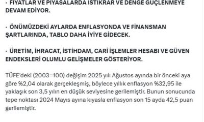 Ticaret Bakanı Ömer Bolat, ağustos ayı enflasyon oranları ve ekonomideki gelişmelere ilişkin sosyal medya hesabından açıklama yaptı. Bakan Bolat, 15 aydır kesintisiz şekilde gerileyen yıllık enflasyonun,...