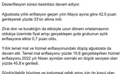 Hazine ve Maliye Bakanı Mehmet Şimşek, ağustos ayı enflasyon oranlarına ilişkin NSosyal hesabından açıklama yaptı. Bakan Şimşek, “Dezenflasyon süreci kesintisiz devam ediyor. Ağustosta yıllık enflasyon geçen...