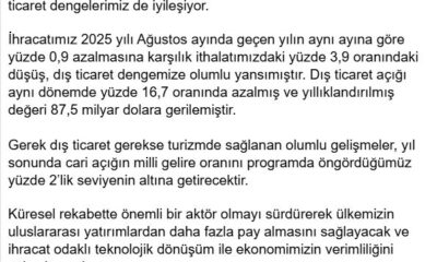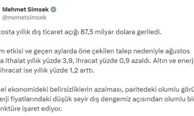 Bakan Mehmet Şimşek, Ticaret Bakanı Ömer Bolatın açıkladığı dış ticaret verilerine ilişkin değerlendirmede bulundu. Bakan Şimşek, sosyal medya hesabından yaptığı açıklamada, “Ağustosta yıllık dış ticaret açığı...