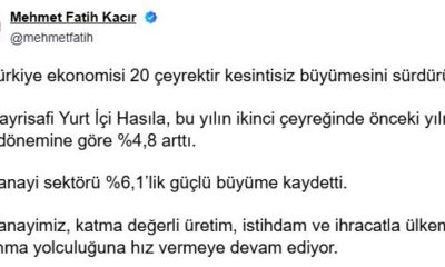 Sanayi ve Teknoloji Bakanı Mehmet Fatih Kacır, NSosyal hesabından yaptığı paylaşımda, “Türkiye ekonomisi 20 çeyrektir kesintisiz büyümesini sürdürüyor. Gayrisafi yurt içi hasıla, bu yılın ikinci çeyreğinde...