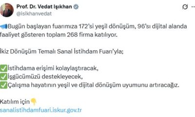 Türkiye İş Kurumu (İŞKUR) tarafından düzenlenen İkiz Dönüşüm Temalı Sanal İstihdam Fuarı, bugün başlıyor. Çalışma ve Sosyal Güvenlik Bakanı Vedat Işıkhan, sosyal medya hesabından fuara ilişkin...