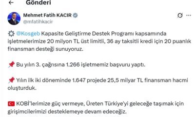 Bakan Kacır, sosyal medya hesabından yaptığı paylaşımda, “KOSGEB Kapasite Geliştirme Destek Programı kapsamında işletmelerimize 20 milyon TL üst limitli, 36 ay taksitli kredi için 20 puanlık...
