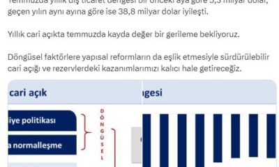 Bakan Şimşek, sosyal medya hesabından açıklama yaptı. Şimşek, “Dış ticarette dengelenme belirginleşiyor. Temmuzda yıllık dış ticaret dengesi bir önceki aya göre 5,3 milyar dolar, geçen yılın...