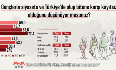 Areda Survey araştırma şirketinin Türkiye genelinde 2 bin 432 kişiyle gerçekleştirdiği araştırmaya göre vatandaşların yüzde 72,4’ü, gençlerin siyasete ve Türkiye’de olup bitene karşı kayıtsız olduğunu düşünüyor....