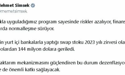 Bakan Şimşek, sosyal medya hesabından yaptığı açıklamada, “Kararlılıkla uyguladığımız program sayesinde riskler azalıyor, finansal piyasalarda normalleşme sürüyor. TCMBnin yurt içi bankalarla yaptığı swap stoku 2023 yılı...
