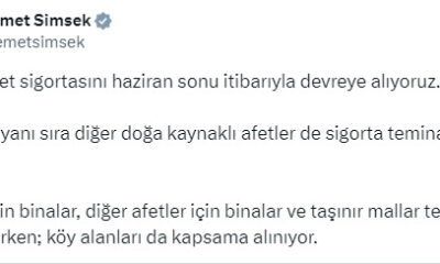Bakan Şimşek, sosyal medya hesabından yaptığı açıklamada, “Zorunlu Afet Sigortasını haziran sonu itibarıyla devreye alıyoruz. Depremin yanı sıra diğer doğa kaynaklı afetler de sigorta teminatına dahil...