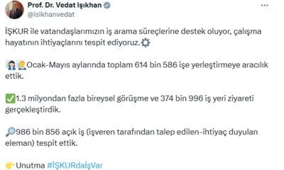 Bakan Vedat Işıkhan, sosyal medya hesabından yaptığı açıklamada, “İŞKUR ile vatandaşlarımızın iş arama süreçlerine destek oluyor, çalışma hayatının ihtiyaçlarını tespit ediyoruz. Ocak-mayıs aylarında toplam 614 bin...