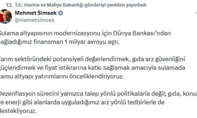 Hazine ve Maliye Bakanı Mehmet Şimşek, sosyal medya hesabından yaptığı açıklamada, “Sulama altyapısının modernizasyonu için Dünya Bankasından sağladığımız finansman 1 milyar avroyu aştı. Tarım sektöründeki potansiyeli...