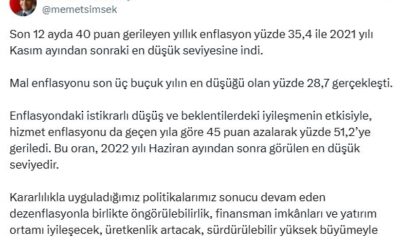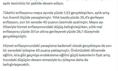 Hazine ve Maliye Bakanı Mehmet Şimşek, mayıs ayı enflasyon verilerine ilişkin sosyal medya hesabından açıklama yaptı. Bakan Şimşek, “Son 12 ayda 40 puan gerileyen yıllık enflasyon...