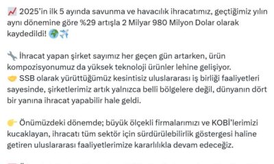 Savunma Sanayii Başkanı Görgün, sosyal medya hesabından yaptığı açıklamada, “2025’in ilk 5 ayında savunma ve havacılık ihracatımız, geçtiğimiz yılın aynı dönemine göre yüze 29 artışla 2...