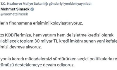 Hazine ve Maliye Bakanı Mehmet Şimşek, sosyal medya hesabından yaptığı açıklamada, “KOBİlerin finansmana erişimini kolaylaştırıyoruz. İmalatçı KOBİlerimize, hem yatırım hem de işletme kredisi olarak kullanılabilecek toplam...