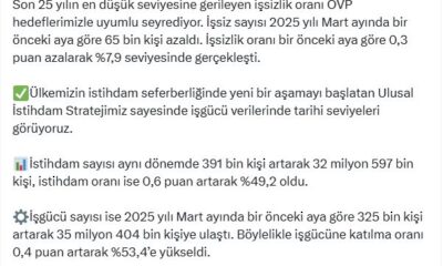 Çalışma ve Sosyal Güvenlik Bakanı Vedat Işıkhan, mart ayı iş gücü istatistiklerine ilişkin sosyal medya hesabından yaptığı açıklamada, “Son 25 yılın en düşük seviyesine gerileyen işsizlik...