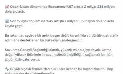 Savunma Sanayii Başkanı Görgün, sosyal medya hesabından yaptığı açıklamada, savunma ve havacılık sanayii ihracatında yeni zirvenin gerçekleştiğini belirterek, “2025 yılı Nisan ayında, savunma ve havacılık sanayiimiz...