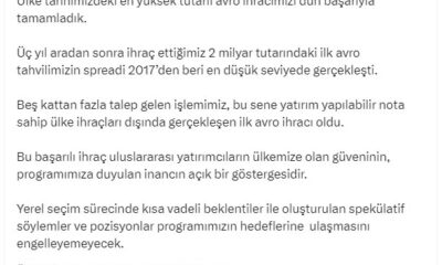 HAZİNE ve Maliye Bakanı Mehmet Şimşek, “Ülke tarihimizdeki en yüksek tutarlı avro ihracımızı dün başarıyla tamamladık. Yerel seçim sürecinde kısa vadeli beklentiler ile oluşturulan spekülatif söylemler...
