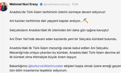 Kültür ve Turizm Bakanı Mehmet Nuri Ersoy, NSosyal hesabından yaptığı paylaşımda, “Anadoluda Türk-İslam tarihimizin izlerini sürmeye devam ediyoruz. Ani kazıları tarihimize dair yepyeni kapılar aralıyor. Selçukluların...