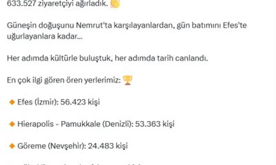 Bakan Ersoy, sosyal medya hesabından yaptığı açıklamada, “Arefe günüyle birlikte bayram tatilinde, Türkiye’nin doğusundan batısına, kuzeyinden güneyine uzanan 200’e yakın müze ve ören yerimizde toplam 633...